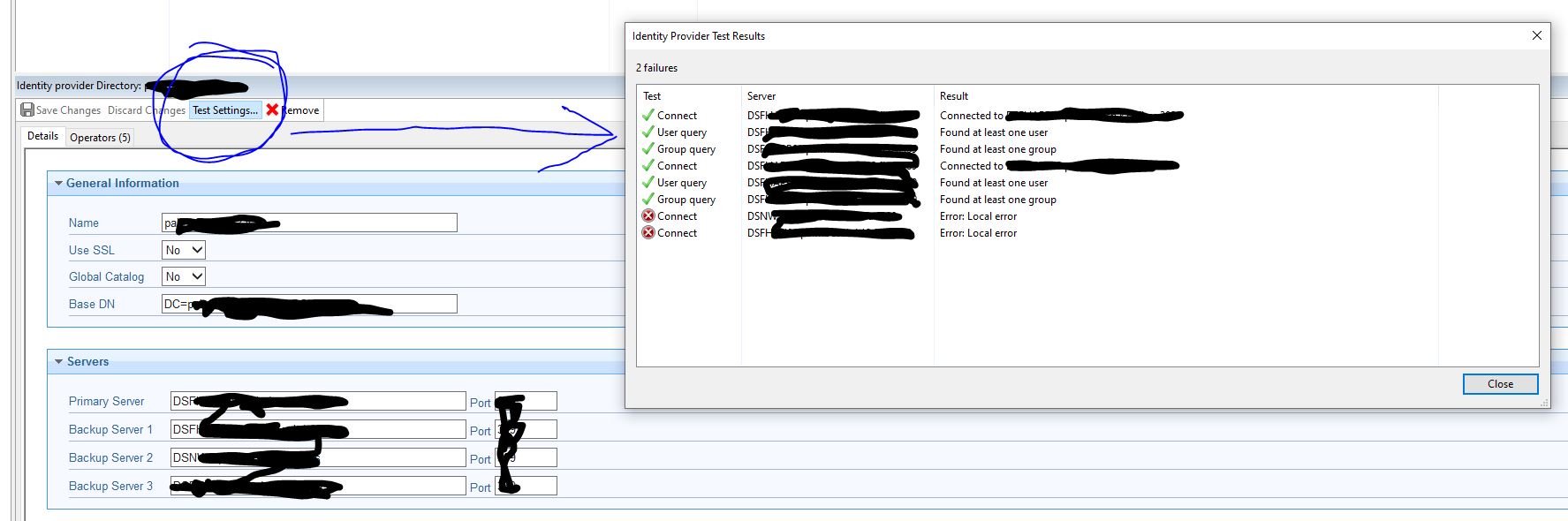 BF Compliance - Linux Master Server - Console AD integration no longer working – using the Console and the " Identity Provider Directories " section – i add 4 AD / DC servers port 389 – hit " test settings " and sometimes 1 server " connects " sometimes 2 servers " connect " sometimes no servers connect – its all hit and miss