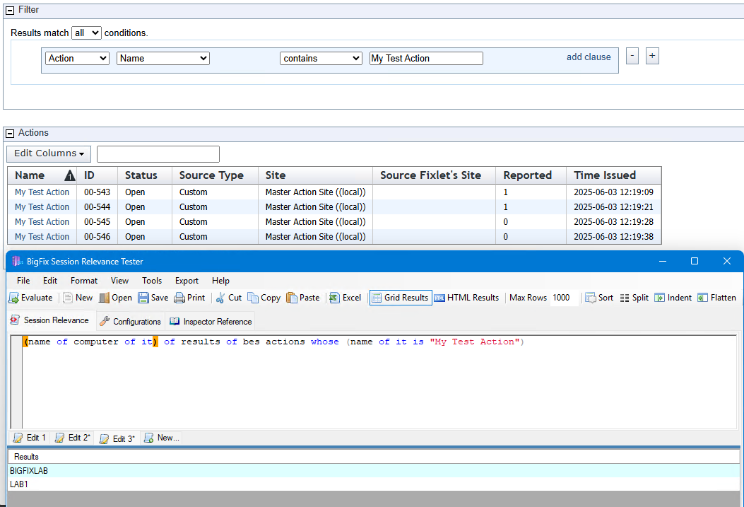 Is there any way by which we can create a custom bigfix web report for having a particular action information in which we have the columns Hostname, Action ID, Action Name, Action Status, Action Start Time & Action End Time all these within the report. Where as we have one challenge where there are multiple actions with custom names but we require an report for all the custom names. Here is the condition that i used for creating it.
