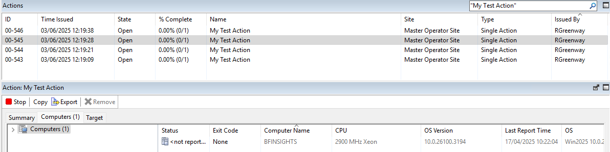 As a crude example of this, from my lab, I create 4 test actions of the same name but only 2 are to computers that are online to process the action . They appear in a basic Action report in Web Reports and in the console but via a session relevance pulling results of bes action, only the 2 that have reported results will appear.