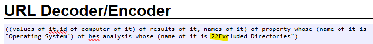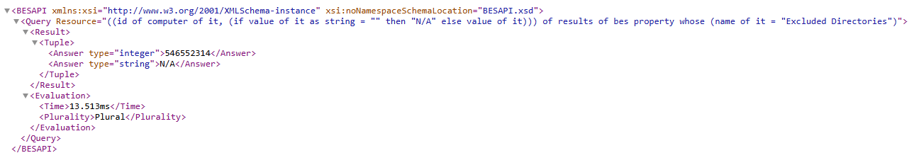 <Query Resource="((values of it, id of computer of it) of results of it, names of it) of property whose (name of it is "Operating System") of bes analysis whose (name of it is "Excluded Directories")">
