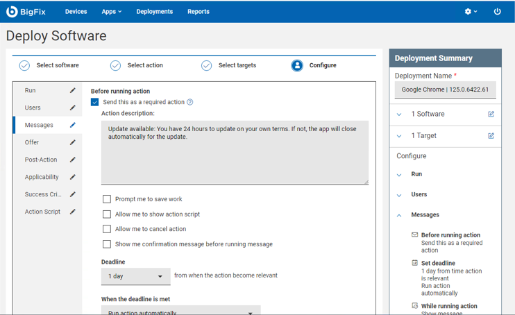 What I want is to create an Action with an offer that will allow users to install patches early. If they do not install accept the offer and install patches before 9pm, I want to force install the patches. 12 hours after patches install I want to for a reboot (with a prompt to save their work).