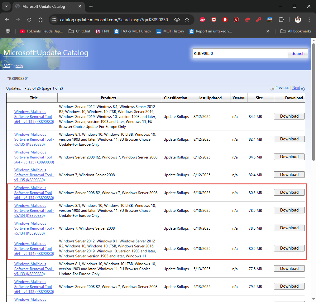 The Download Center link at https://www.microsoft.com/en-us/download/details.aspx?id=9905 shows it was updated on August 12 to version 5.135 with new download URL https://download.microsoft.com/download/2/c/5/2c563b99-54d9-4d85-a82b-45d3cd2f53ce/Windows-KB890830-x64-V5.135.exe