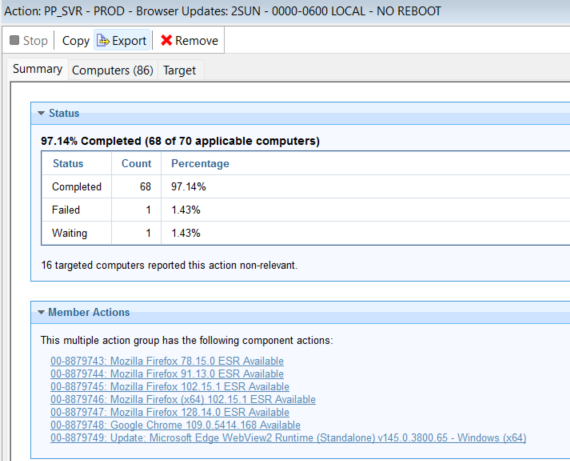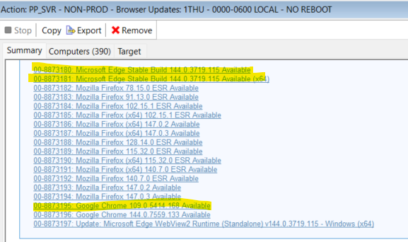 All the patch policy action from FEB12-17 contained the same components from the browser. However, when we were investigating the issue, the first patch policy for prod scheduled last Feb22 did not include the same MS Edge fixlet. We checked the WebUI patch policy external fixlets and the MS edge was there but was not included on the patch policy action. Upon checking, same goes with google chrome latest version.