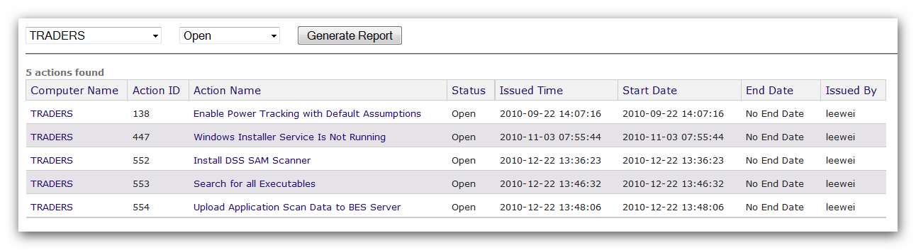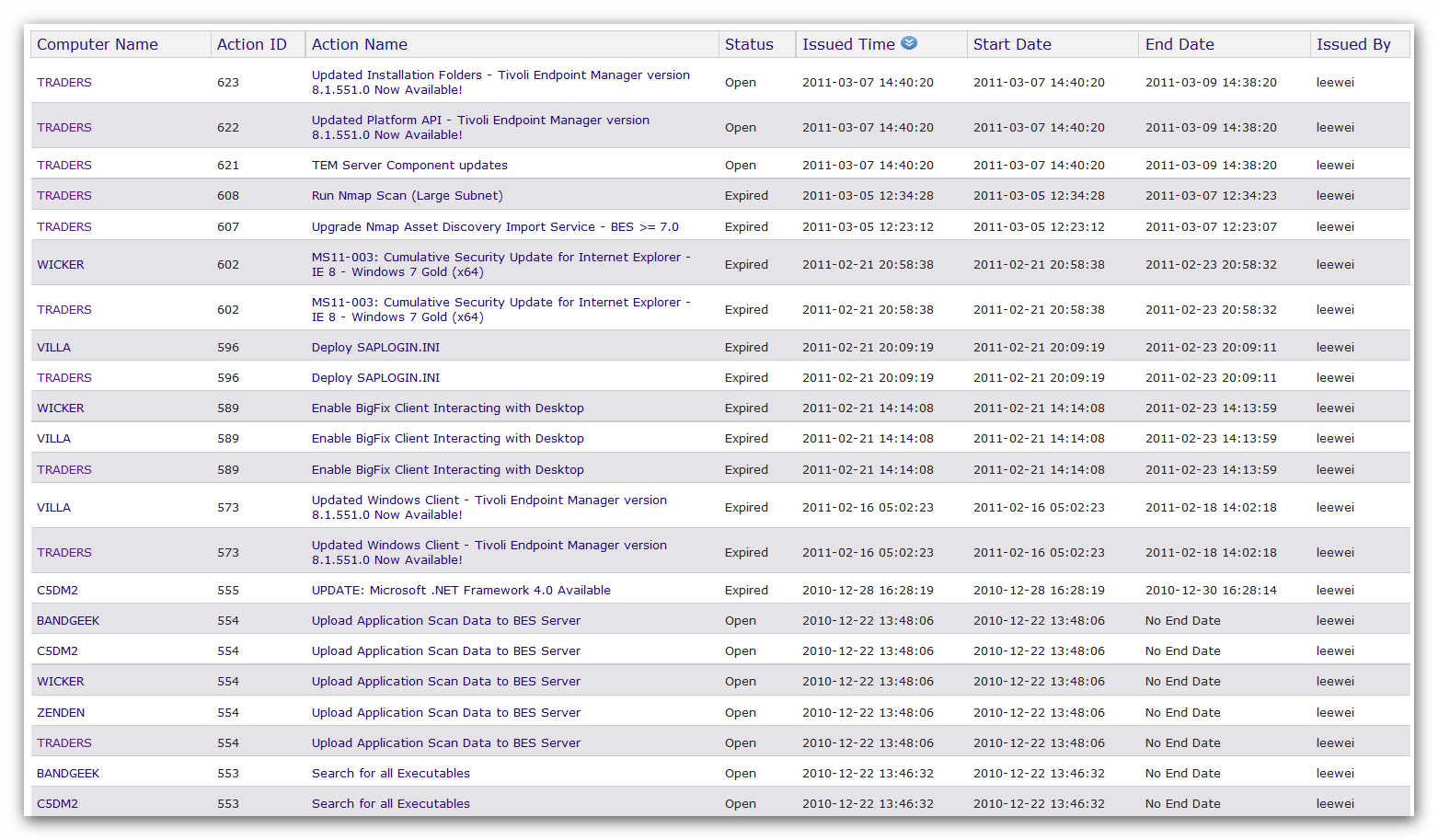 Computer Name Action ID Action Name Status Issued Time Start Date End Date Issued By
