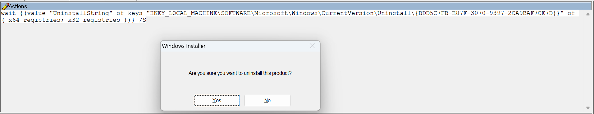 If you were dynamically searching for an unknown GUID the relevance substitution makes sense but with a static GUID being coded in the registry path, I’m not seeing the advantage of then looking up and calling its uninstall string